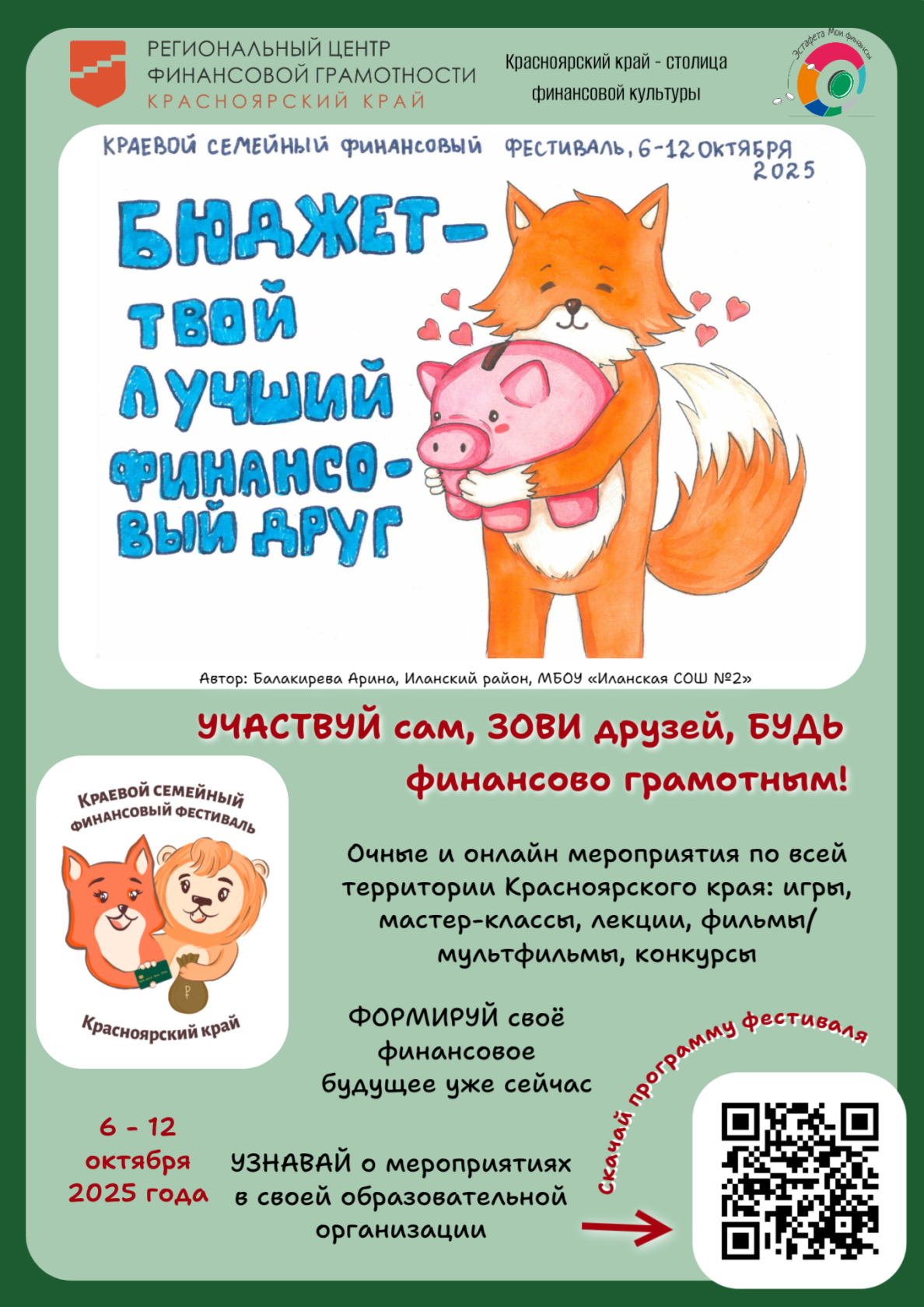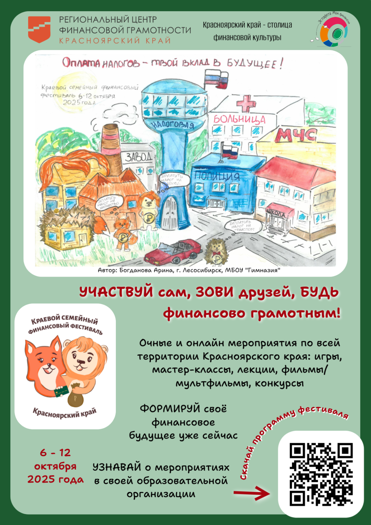 С 6 по 12 октября 2025 года в Красноярском крае пройдет VI Краевой семейный финансовый фестиваль. Приглашаем всех присоединиться к самому крупному мероприятию по финансовой грамотности в Красноярском крае!