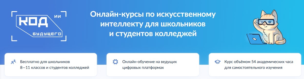 Открыта запись на бесплатное обучение школьников 8 - 11 классов и студентов колледжей базовым навыкам искусственного интеллекта на цифровых образовательных платформах в проекте «Код будущего. Искусственный интеллект»*.